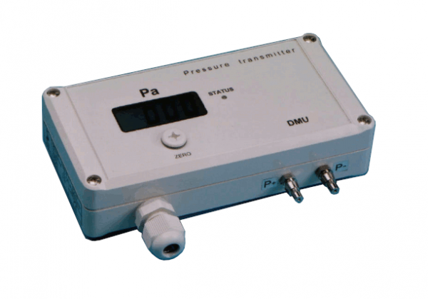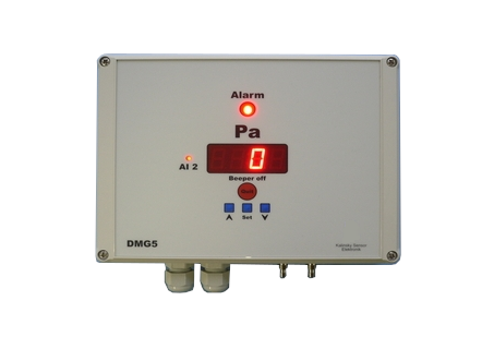 Das Druckmessgerät DMG5 wurde zur Überwachung des Raumdrucks in Reinräumen entwickelt. Es beinhaltet einen Differenzdrucksensor für den Bereich +/-50 Pa oder +/-100 Pa, ein rot leuchtendes LED-Display, Alarmlampe, Hupe, zwei Analogausgänge (0-10V und 4-20 mA) zum Anschluss an einen Datenlogger und zwei Schaltausgänge.